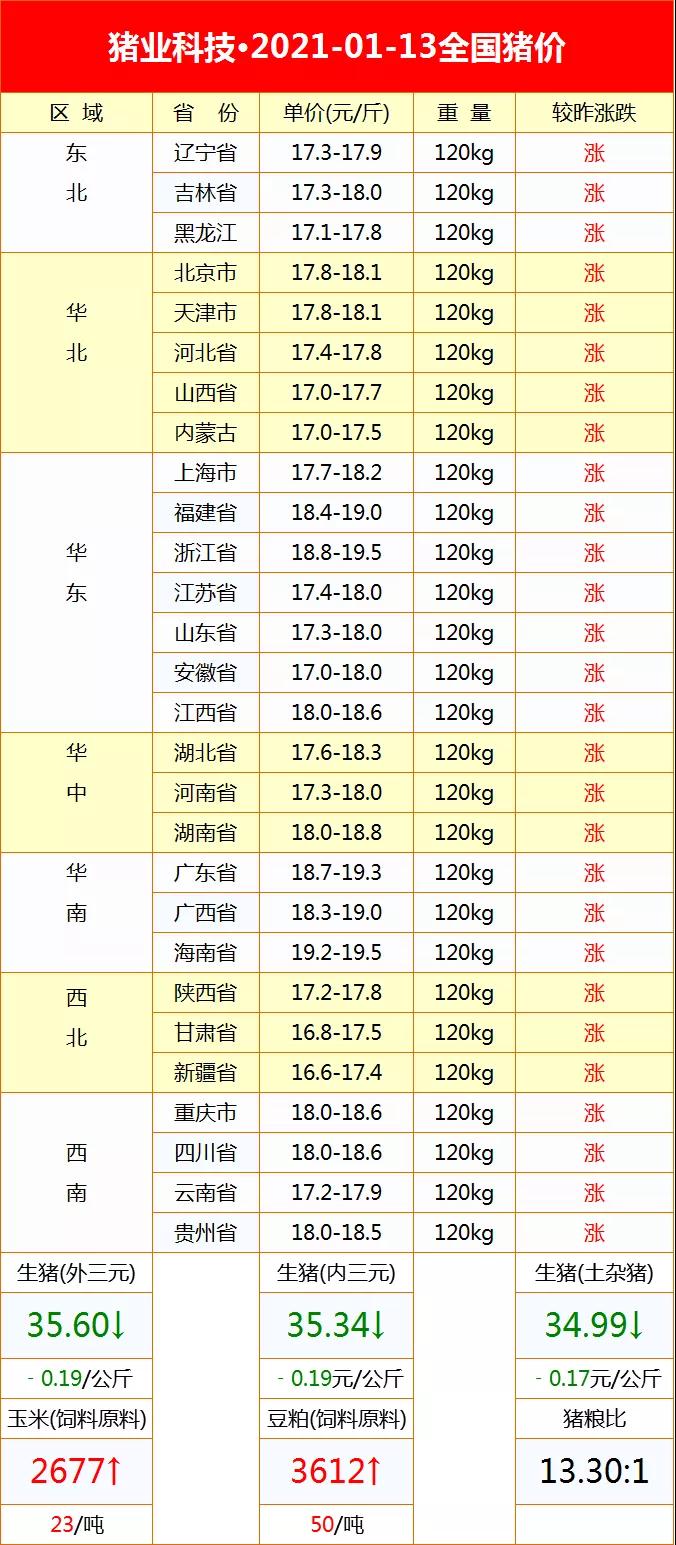 今日豬價?2021-01-13全國豬價(漲?。?/span>