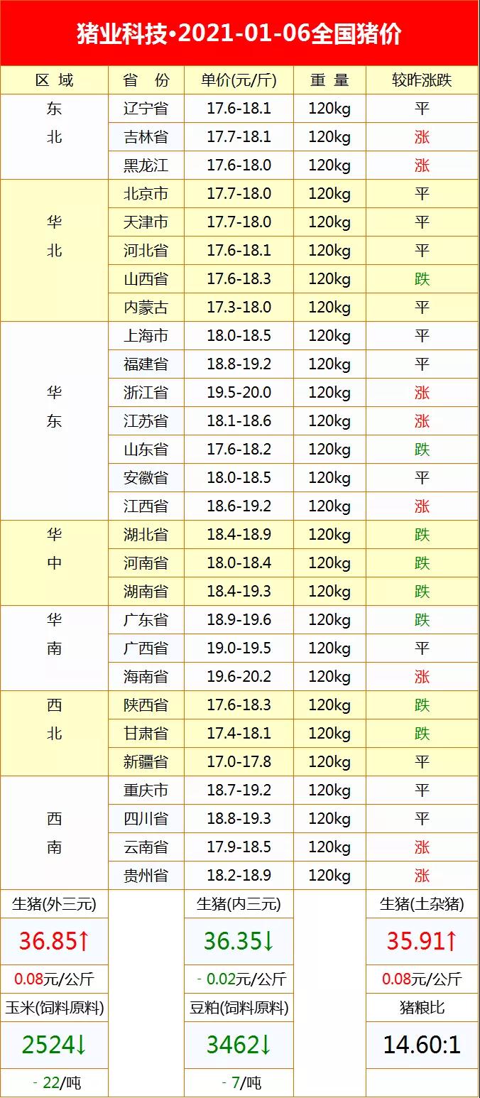 今日豬價?2021-01-06全國豬價